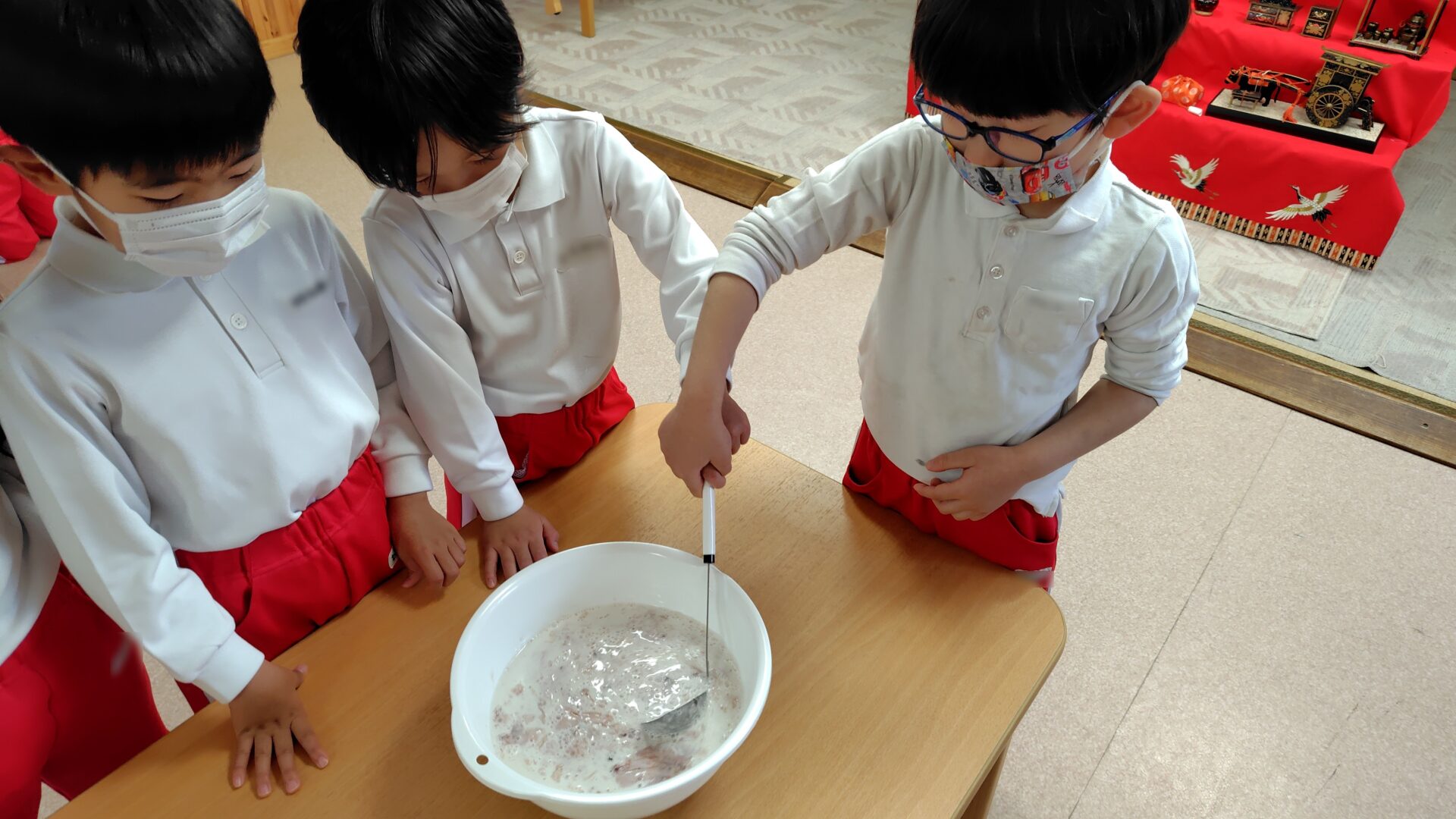 年長さんとのおわかれ会をしました。みんなでゲームをして遊び「小学校に行っても忘れないでね!」と年中さんと年少さんからプレゼントをもらいました。年長さんからはみんなにフルーチェを作って給食で食べてもらいました。