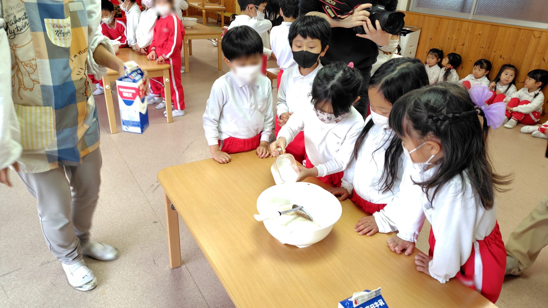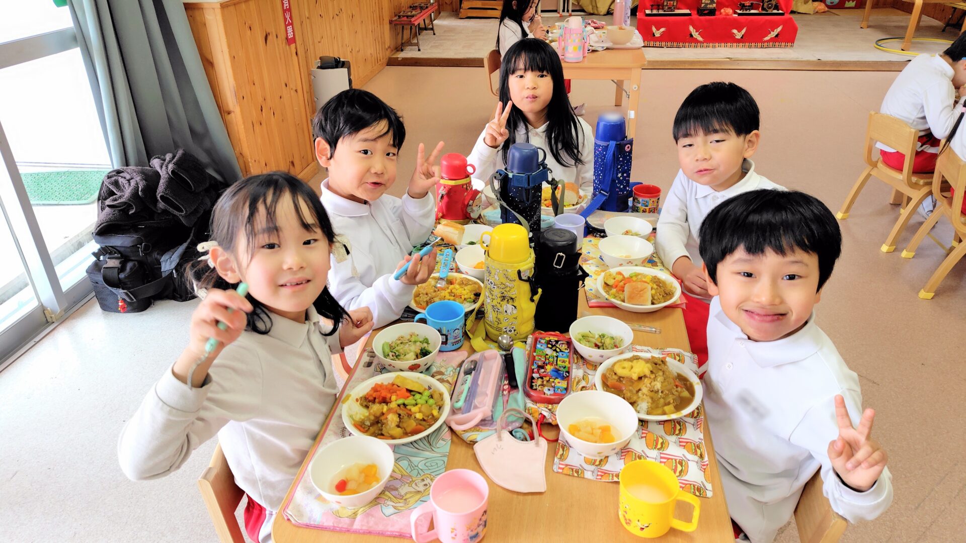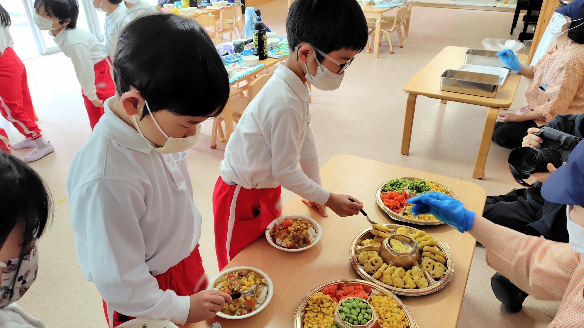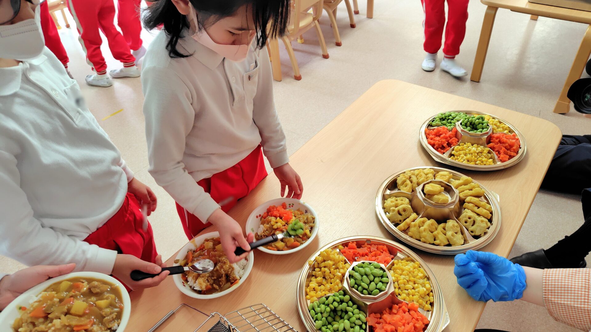 年長さんは特別給食でカレーバイキングをしました!初めての取り組みでしたがコーンや枝豆、星形に切った人参をカレーライスにトッピングするのを楽しみました。人気だったのがミニオンの形をしたポテトです!色々な顔があり友達同士で「笑ってるね~」と見せ合う姿もありました。