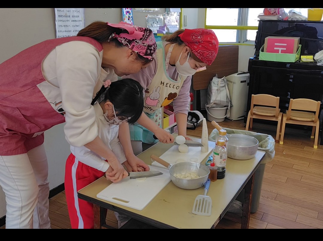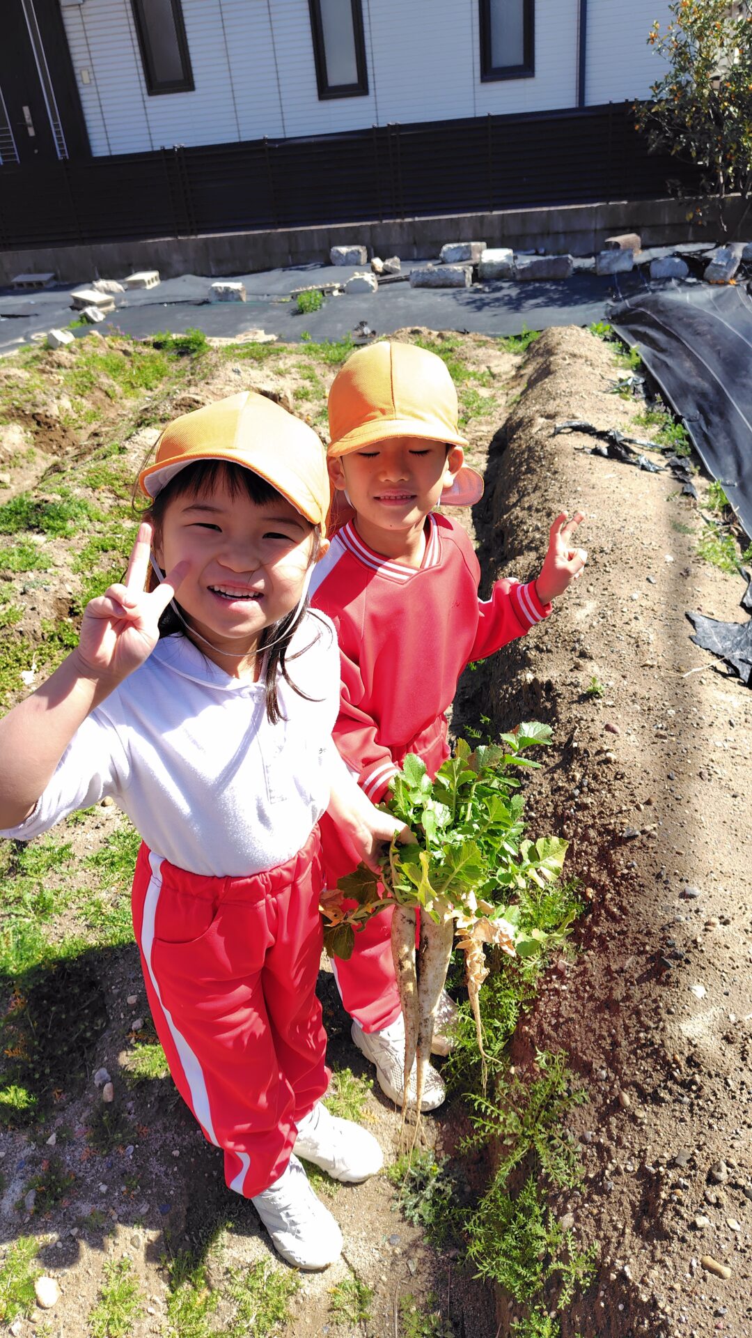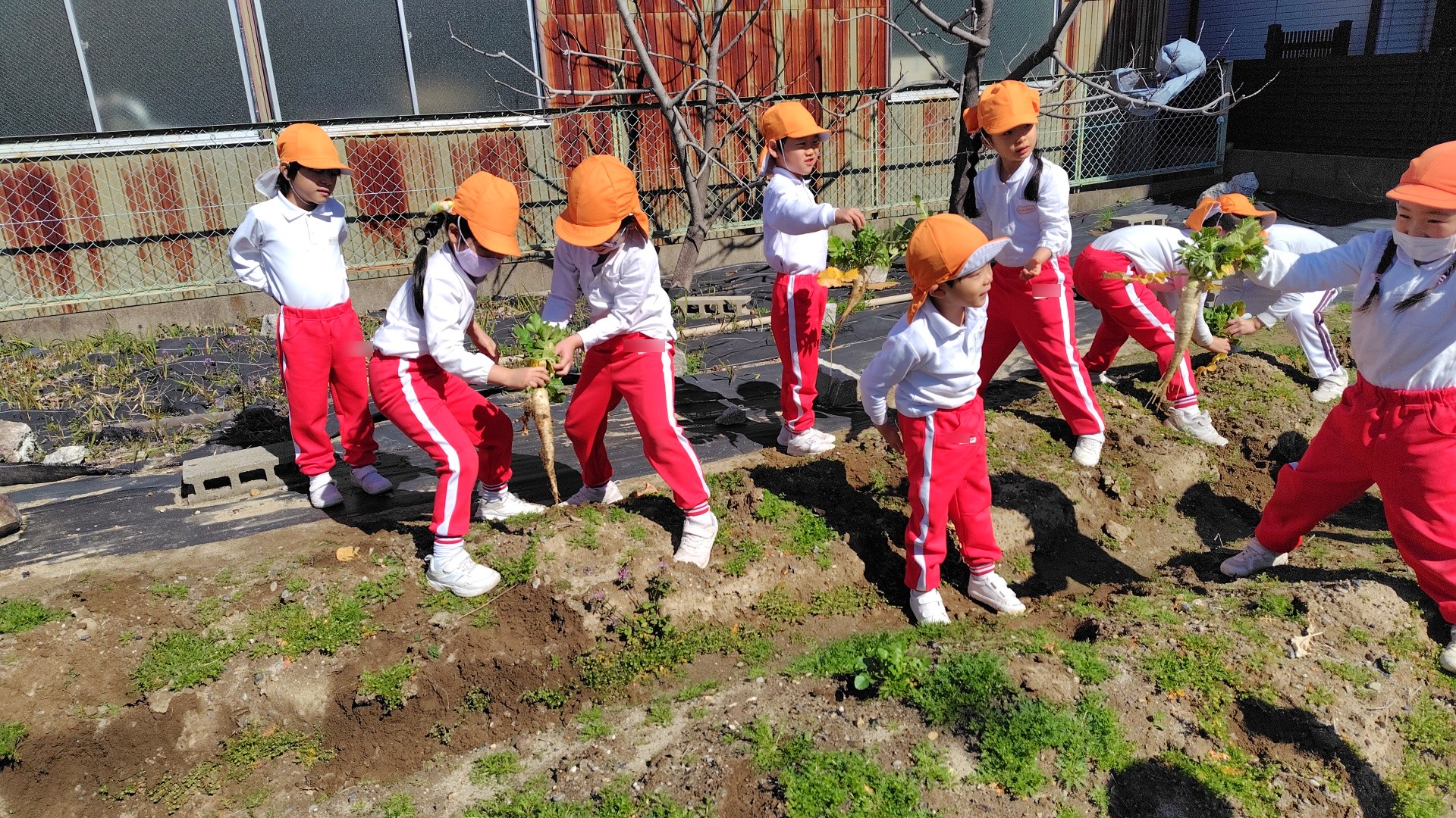 年長さんが園の畑で育てた大根を使って大根スープと大根ステーキを作りました。畑に大根を収穫に行くとなかなか抜けない大根にみんな苦戦しながら友達と力を合わせて収穫しました。小さめの物や先が2つに分かれた物など様々な大根が出来ました。 園に戻って担任の先生から作り方を聞いた後、実際に包丁を使って大根を切りました。鍋に入れてぐつぐつ煮えてくると「いいにおいがする~」「はやくたべたい」と完成を心待ちにしていました。みんなで美味しく食べ収穫した大根は家に持ち帰りました。お家でもたくさん食べてね!